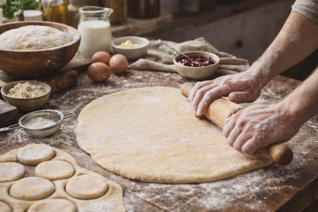 6. Vykynuté těsto vyklopíme na pomoučený vál a rozválíme na plát silný asi 1 cm.
